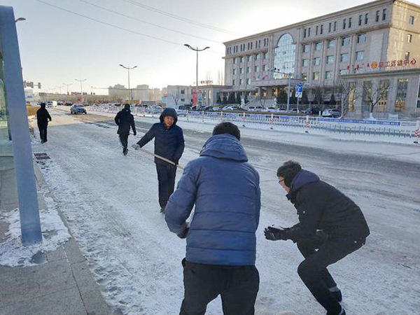 8日,东康公司一线管理人员清晨到康巴什和伊旗各站点进行路面积雪和结冰路段撒融雪剂除冰除雪工作,为清除道路安全隐患,大家分工明确,齐心协力完成了清扫工作,保障市民安全乘车。