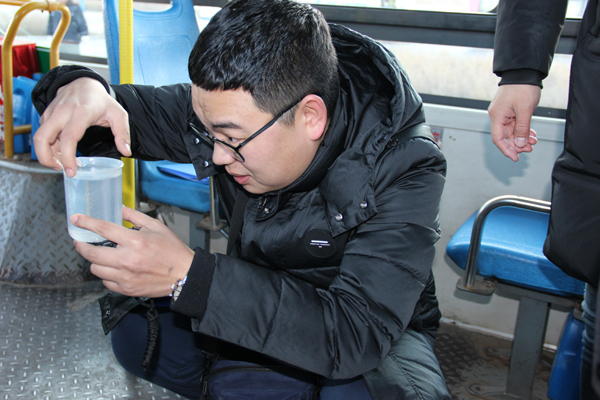 比赛中,各驾驶员沉着冷静、服从裁判,通过比武尽展公交人拼搏精神。在现场,笔者看到,为考验驾驶员的平稳驾驶水平,组委会将装有300毫升清水的容器放在车厢内,裁判根据洒水量多少给出相应分数。在该项比赛中,东胜公司5路驾驶员杨文略全程没有一滴洒水。