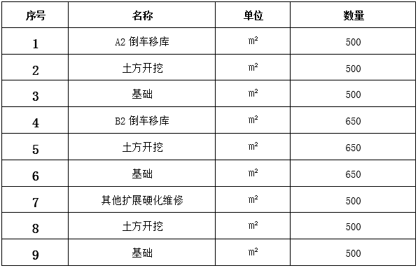 4.服务范围:A2倒车移库的土方开挖及基础,B2倒车移库的土方开发及基础,其他扩展硬化维修的土方开发及基础。(具体详见清单)。